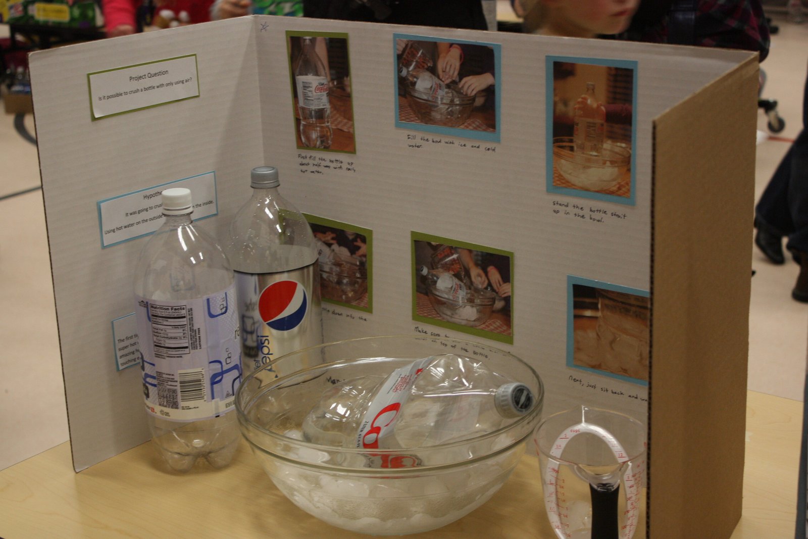 I borrowed a few science fair idea books from a teacher at my school. My kids looked through the books and settled on a project. The project involved putting hot water inside a bottle, ice around the bottle, and air pressure eventually crushing the bottle. The did all of the work themselves. My son did the typing. My daughter wrote some of the explanations by hand. I was very impressed with their teamwork.
