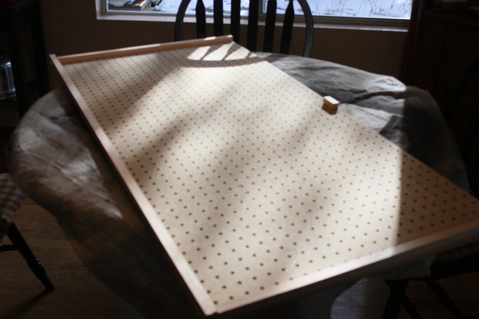 I drilled pilot holes in the pegboard and trim, to keep the wood from splitting.