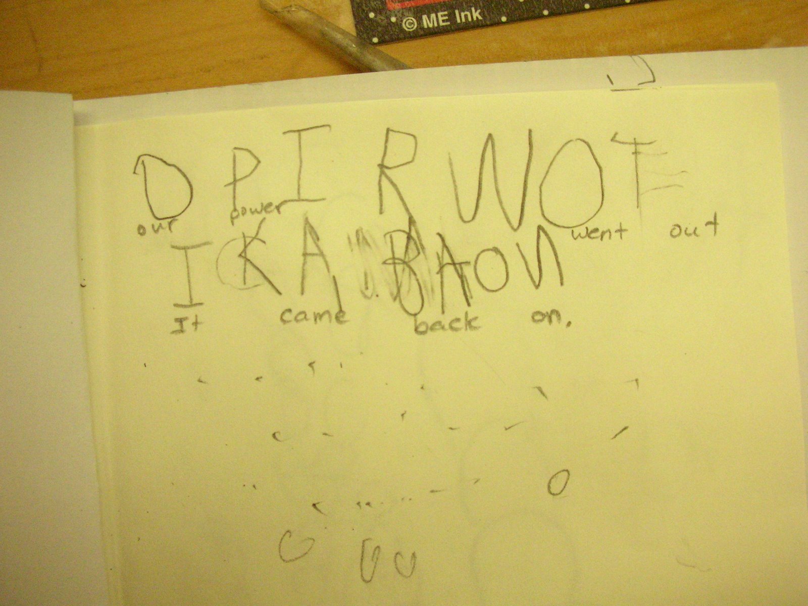Below, is another great example of a typical kindergarten writer in January, of half time kindergarten. This little boy didn’t want to write a simple sentence like. “I like snow.” He wanted to tell a story. He wrote, “Our power went out. It came back on.” You’ll see that he was able to figure out beginning and ending sounds for many of the words.